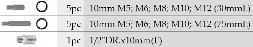 Jogo composto por 10 bits m (30/75mml) e 1 chave para bits de 1/2".