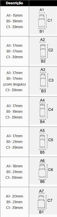 Composição: (1x) Fresa plana 15x19mm (1x) Fresa angular 17×17mm (1x) Fresa plana 17x17mm (com ângulo) (1x) Fresa plana 17x19mm (1x) Fresa angular 17x21mm (1x) Fresa plana 18x21mm (1x) Fresa plana 20x21mm (1x) Punho em T 135x160mm com chave de caixa hex. 19mm (1x) Adaptador hexagonal 19x170mm (1x) Cortante 15.5x225mm (1x) Chave hexagonal em L 2.5mm