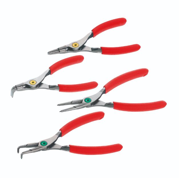 Conjunto de 4 alicates de anel de retenção. Modelo de precisão. Pontas de aço harmônicas inseridas nas garras: maior durabilidade que as pontas torneadas. Superfície de apoio dos anéis entre as pontas e as garras. Mola integrada ao corpo do alicate. Cabos revestidos em PVC antiderrapante.