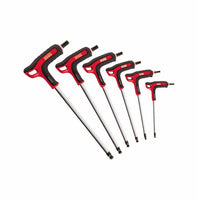 Conjunto de 6 chaves hexagonais de cabeça esférica com cabo bimaterial. Para parafusos com sextavado interno. Modelo que permite operar com inclinações de até 30° em relação ao eixo do parafuso. Cabo ergonômico bimaterial com revestimento antiderrapante. Lâmina feita de aço especial de alta liga de cromo vanádio. Acabamento cromado com pontas brunidas para garantir máxima precisão dimensional e perfeito acoplamento com o parafuso.