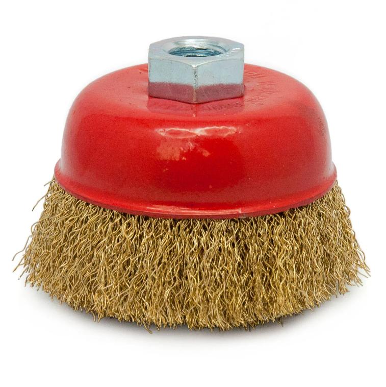 Catrabucha tipo copo com arame ondulado para uso em esmerilhadeiras angulares. Adequadas para rebarbar e para escovar grandes superfícies.