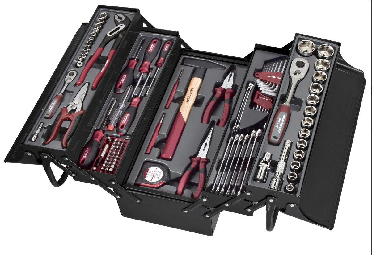 • MALA FERRAMENTAS PRO LINE 106PCS – KRAFTWERK Caixa de ferramentas metálica, preta, 5 divisões – 106 peças – Chaves combinadas: 8 a 19 mm – Roquetes de 1/4" + 1/2" – Chave de parafusos com fenda: 4 a 6 mm, PH1 e 2 – Chaves e caixa de 1/4" – 3,5 a 10 mm – Chaves de caixa de 1/2" – 10 a 32 mm – Ferramentas de impacto e alicates
