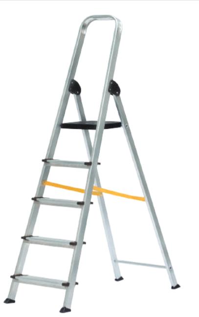 Escadote reforçado em alumínio. Degraus estriados antiderrapantescom largura de 120 mm e duplo rebite. Plataforma lacada sem superfícies cortantes e arco de segurança. Cintas de segurança (a partir de 5 degraus) e pés antiderrapantes. Este produto tem de ser levantado em loja física.