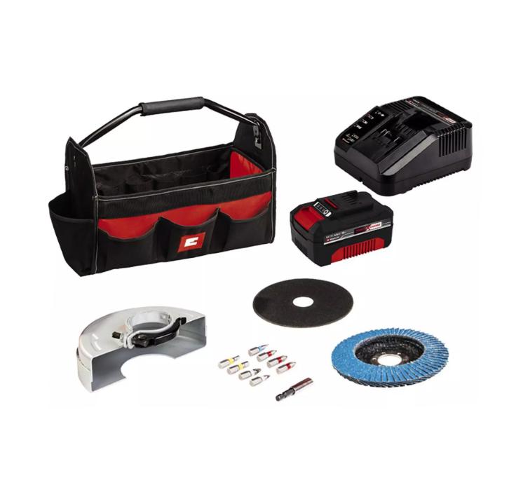 1 bateria Power X-Change: 4,0 Ah; 1 carregador: 3 A; 1 bolsa Einhell; 1 protetor de disco de corte, 1 disco de corte (115 x 1,2 mm), 1 disco de desbaste (115 mm), 1 caixa de bits (8 bits+porta bits)