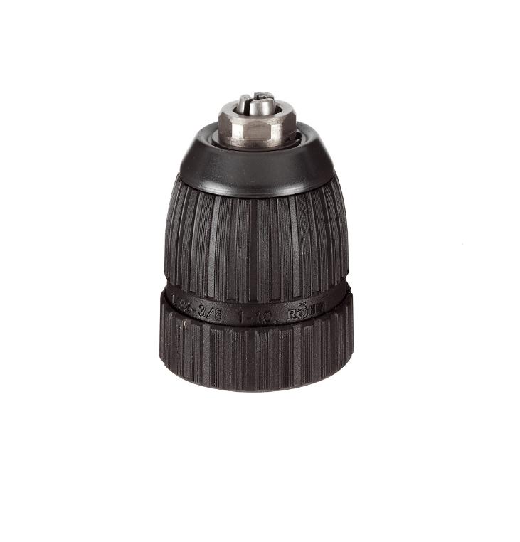 Mandril sem chave, para serviço leve, rosca interna, furo passante para inserção de parafuso de retenção para funcionamento reverso, para furadeiras e parafusadeiras sem fio, bem como furadeiras padrão e reversíveis para uso doméstico, permitindo troca rápida de brocas.