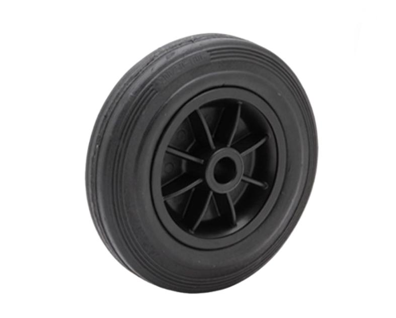 Roda em borracha cinza. Nucleo em polipropileno com cubo liso.